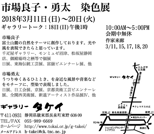 市場良子・勇太 染色展 3月 11, 2018 yutai 2018年3月11日(日)~20日(火)10:00AM-5:00PM、会期中無休【会場】 ギャラリータケイギャラリートーク(18日(日)午後1時)あります